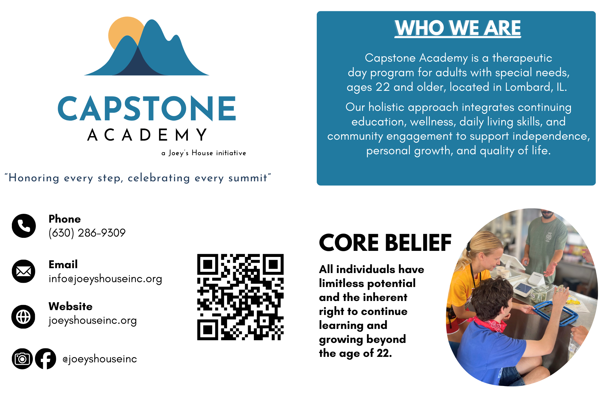 Capstone Academy Capstone Academy is a year-round day program focused on continuing education in the western Chicago suburbs. Individuals ages 22+ are eligible for enrollment. Application Coming Spring 2026